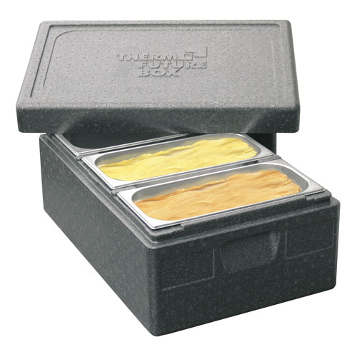 3 db 360x165 mm méretű fagyistégely behelyezésére alkalmas, opció: 2 db GN 1/4 jégakku, opció: magasító keret a púpozott tégelyekhez, rugalmas, ellenálló anyag, anyaga: melegen préselt polipropilén granulátum, OETI engedély, származási hely: Németország.