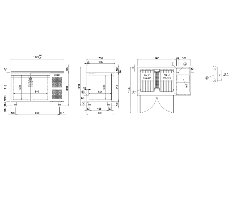 Coldline TA13/1ME-710 Smart fagyasztós munkaasztal, 2 ajtós kivitel, hátsó felhajtással, -15 -22 °C