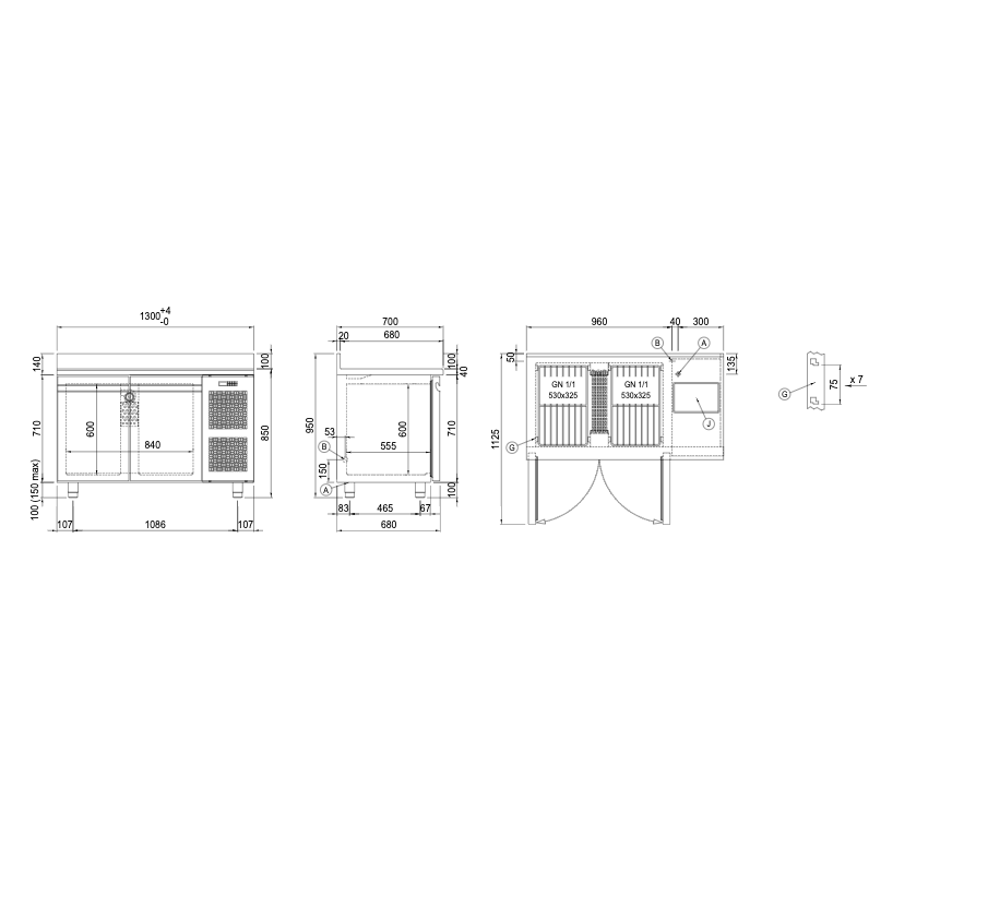 Coldline TS13/1BE-710 Smart fagyasztós munkaasztal, 2 ajtós kivitel, pult alá helyezhető, -15 -22 °C