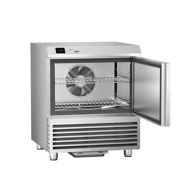 Rozsdamentes (AISI304) burkolat kívül és belül. Felső rész rozsdamentes (AISI304) munkafelület. Termelési ciklus -9°C -> -18°C: 20 kg / ciklus. Elektromos vezérlés. A vezérlő panel a felső részen helyezkedik el, így könnyen hozzáférhető. Maghőmérős érzékelővel felszerelve. Levegő kiolvasztás.