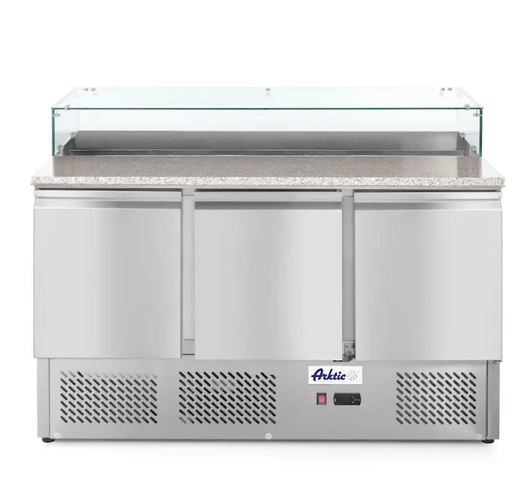Háromajtós pizza munkaasztal 380L, beépített feltéthűtővel