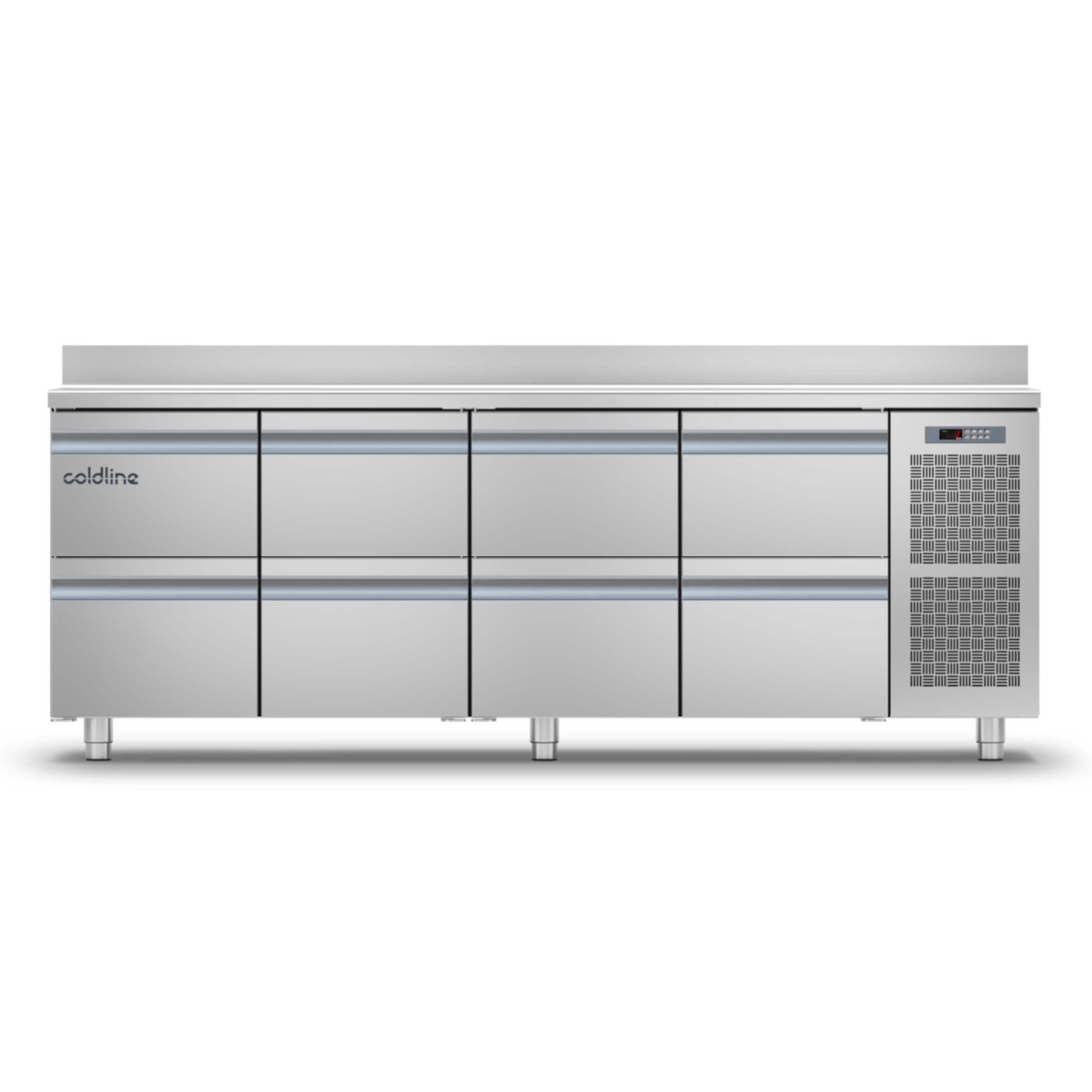 Coldline TA21/1ME-710 Smart hűtött munkaasztal, 8 fiókos kivitel, fedlappal, hátsó felhajtással -2 +8 °C